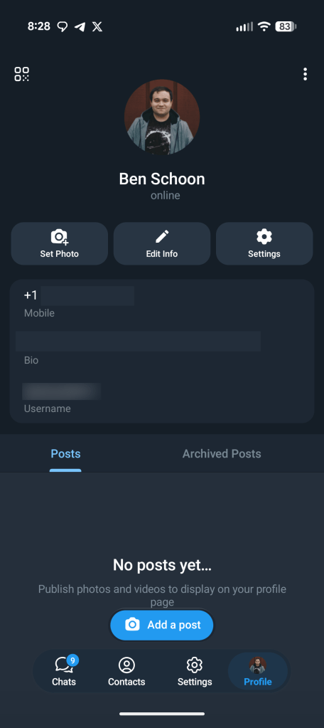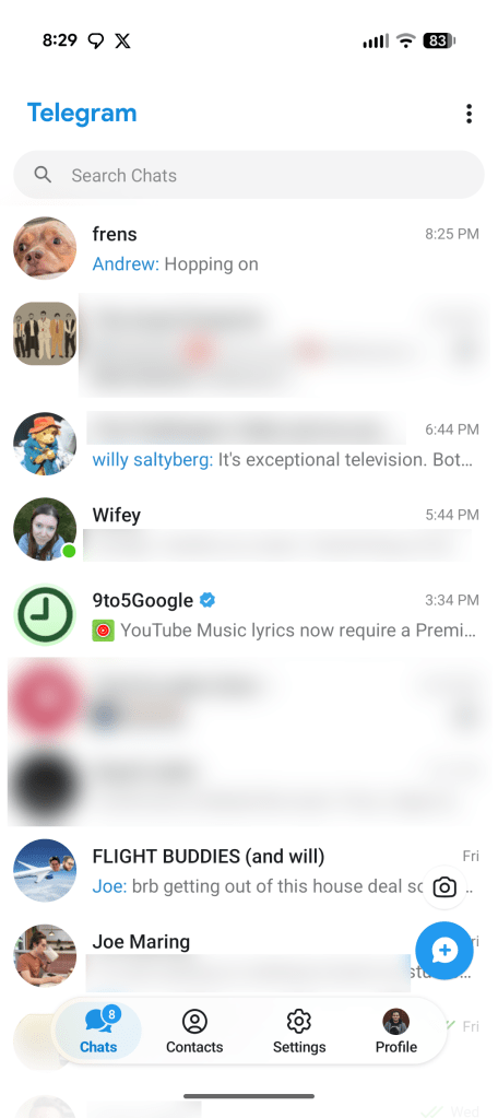 In the latest update, Telegram embraces this new look with a four-tab bottom bar that feels ripped straight out of iOS, as well as new transparent elements that are especially visible in the app’s light mode. It’s not quite the same as you see on iOS, but it’s very clearly inspired by Apple’s new design language (which, after all, is more than just transparency). The four tabs are for Chats, Contacts, Settings, and Profile, and the bottom bar stays open on all of them even as you scroll.