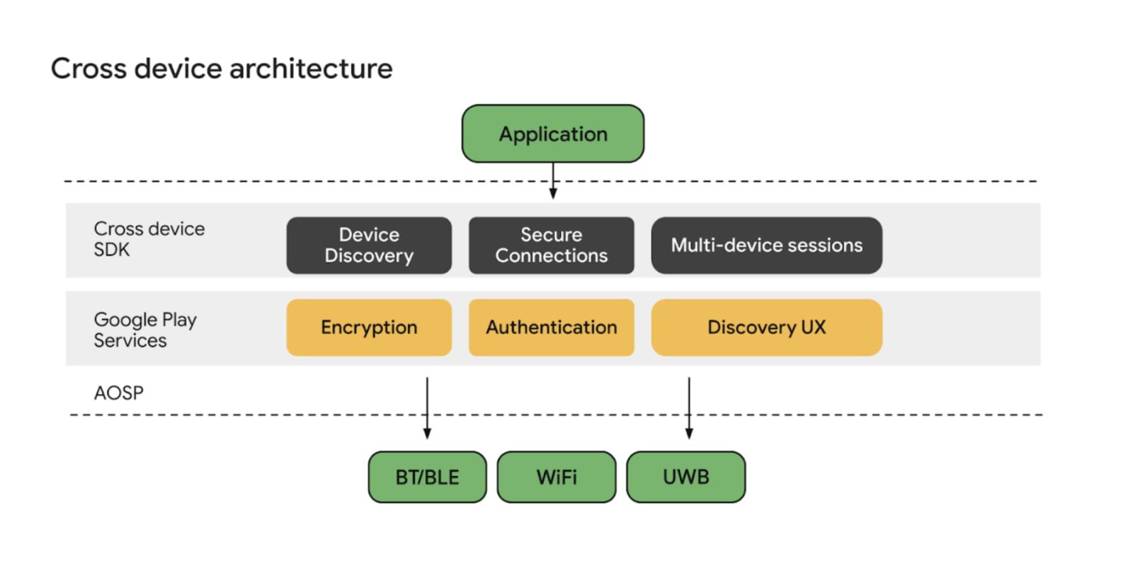 The Cross device SDK “allows developers to build rich multidevice experiences with a simple and intuitive set of APIs.” Namely, Google takes care of device discovery, authentication, and connection protocols (Bluetooth, Wi-Fi, and UWB), so that app devs can just focus on “delightful user experiences and connecting these experiences across a variety of form factors and platforms.” There are three core functionalities offered by the SDK: