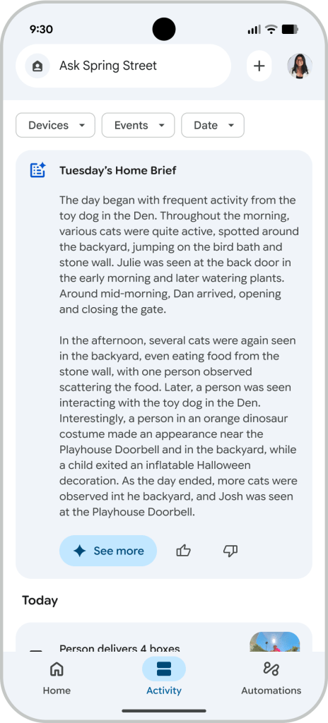 Scroll less and find more: Search your video history with Ask Home. Just ask something like, “What happened to the vase in the living room?” and get an event description along with relevant video clips.