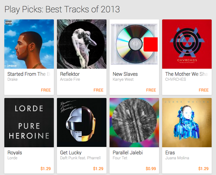 As the hours tick away to the end of 2013, Google Play Music is still offering a few freebies to help ring in the new year. Under the “Best Tracks of 2013,” Google is giving away some of the following songs: