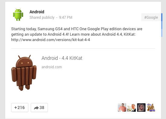 Oh Google, you’re so good sometimes when you let the world know that the HTC One Google Play edition isn’t the only device receiving KitKat today. According to the +Android page on Google+, the Samsung Galaxy S 4 Google Play edition is also beginning its Android 4.4 KitKat rollout.