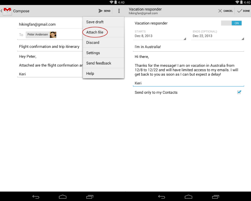 Just in time for the holidays and peak travel season, Google is adding some awesome features to Gmail on Android. Just announced via Google+, Gmail on Android now includes a vacation responder, attachment support for any file type and print capability for hard copies of emails for users on Android 4.4 KitKat.