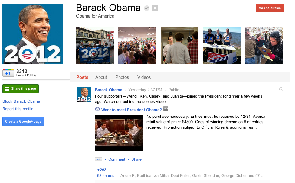 Welcome to the Obama 2012 Google+ page. We’re still kicking the tires and figuring this out, so let us know what you’d like to see here and your ideas for how we can use this space to help you stay connected to the campaign.