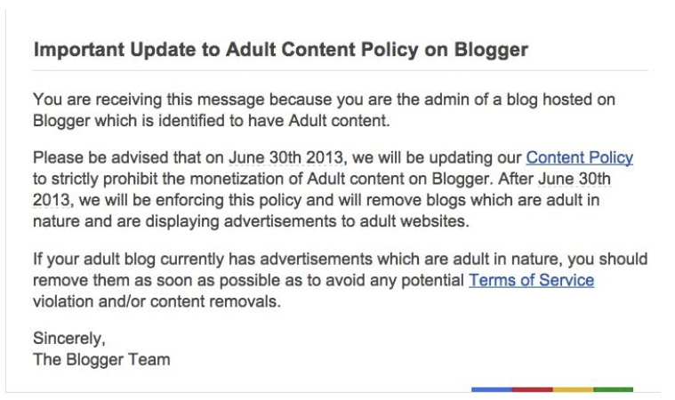 The Verge reports that Google is banning the monetization of adult content on its Blogger service, though adult content will continue to be permitted provided there are no accompanying ads for adult sites.