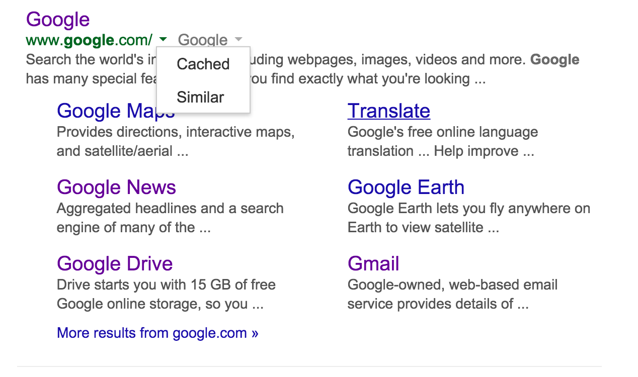The company every so often will take a snapshot of a website and save it to its cache, so the page can still be viewable in the event that the website its hosted on becomes inaccessible. You can access the cached version of a webpage, like the one above, by searching for it on Google, clicking on the green down arrow directly to the right of a result URL, and clicking “Cached.” Click here to see the cached page for Google.com.