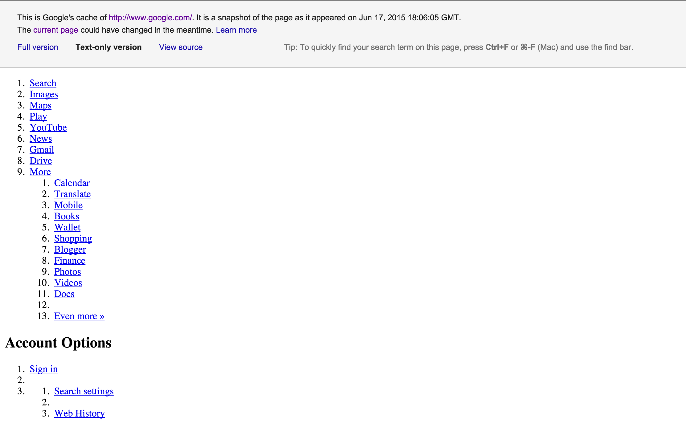Here’s what visiting the text-only cached version of Google.com looks like: