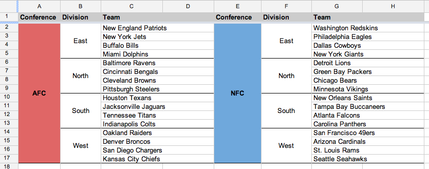 In the spirit of the NFL season, let’s say you want to host a football tournament for your friends. To make it easier for them to cast their votes on the winning team, you organize the NFL teams by conference and division in a Google spreadsheet. After applying vertical merges to all of the conference and division headers and horizontal merges across the team names in each conference, you’re ready to share with your friends for the tournament!