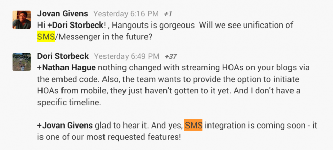 Droid Lifepoints us to comments by Dori Storbeck, who manages the Hangouts and Chat Google+ community, which confirm integration with SMS is highly requested and coming soon.