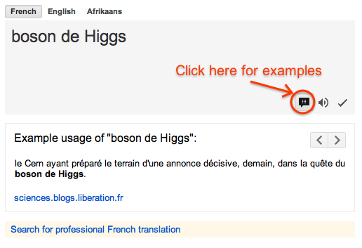 To use the feature, type into the left-hand text box of Google Translate, and then click on the example sentence icon on the bottom right (screenshot above).