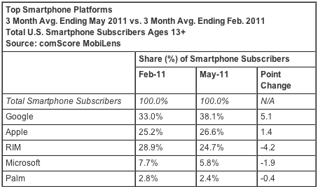 Today comScore posted their latest smartphone market share report showing Google’s Android as the top smartphone platform for the three-month reporting period ending in June 2011, up 5.4 percent from the previous March 2011 report.