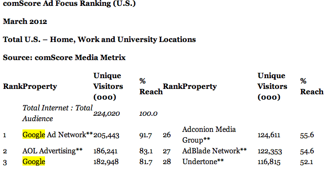Google websites came out on top in the Top 50 Properties category with 189.7 million visitors in March. Meanwhile, Microsoft sites landed the No. 2 spot with 178.9 million visitors, followed by Yahoo! sites at 175.4 million visitors. The Mountain View, Calif.-based Company’s Ad Network also grabbed the crown in the Top 50 Ad Focus Ranking categorylast monthwith a reach of 91.7 percent of Americans online. AOL Advertising netted 83.1 percent, and Google itself closed out the top three at 81.7 percent.