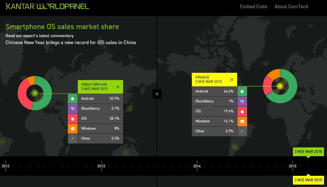 When it comes to the market by OS usage, Android is still on top, growing 0.7 percentage points to 52.4% this quarter. Apple experienced slightly less growth at 0.3 percentage points to capture 39.2% of the market up from its 38.9% share last quarter. That means the majority of the growth, once again, comes at the expense of BlackBerry and Microsoft. Expand Expanding Close