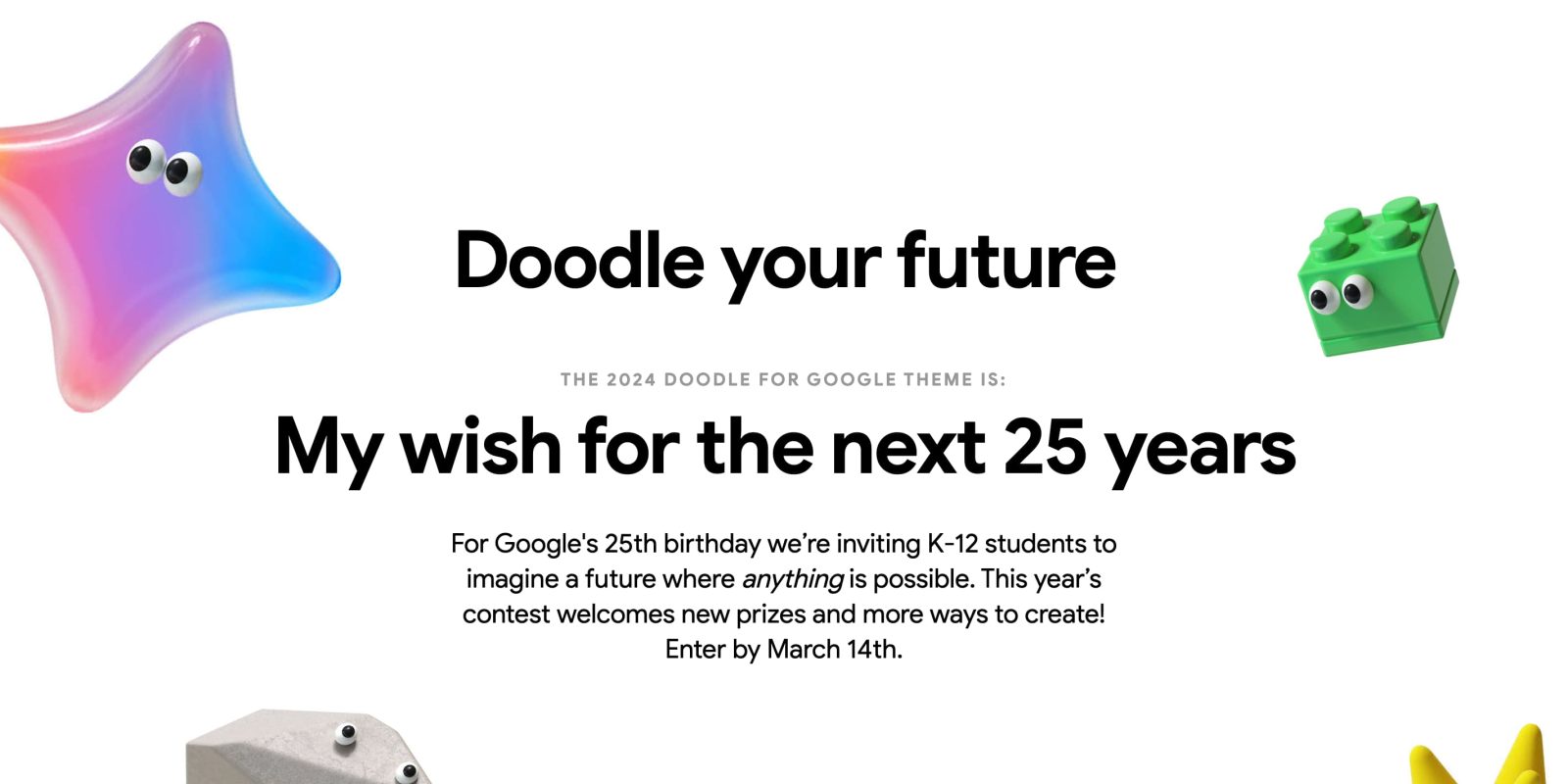 Expand Expanding CloseGoogle this week invited K-12 students in the US to create a Doodle for its Search homepage. For 2024, the Doodle for Google theme is “My wish for the next 25 years.”