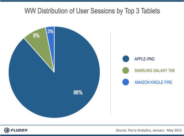 Flurry further cited iOS as the more attractive platform to developers due to its stronghold on the tablet market share. The pie chart below represents a sample size exceeding 5 billion total user sessions. It reveals the Galaxy Tab and Amazon Kindle Fire sit at “very distant second and third places in terms of consumer usage.”