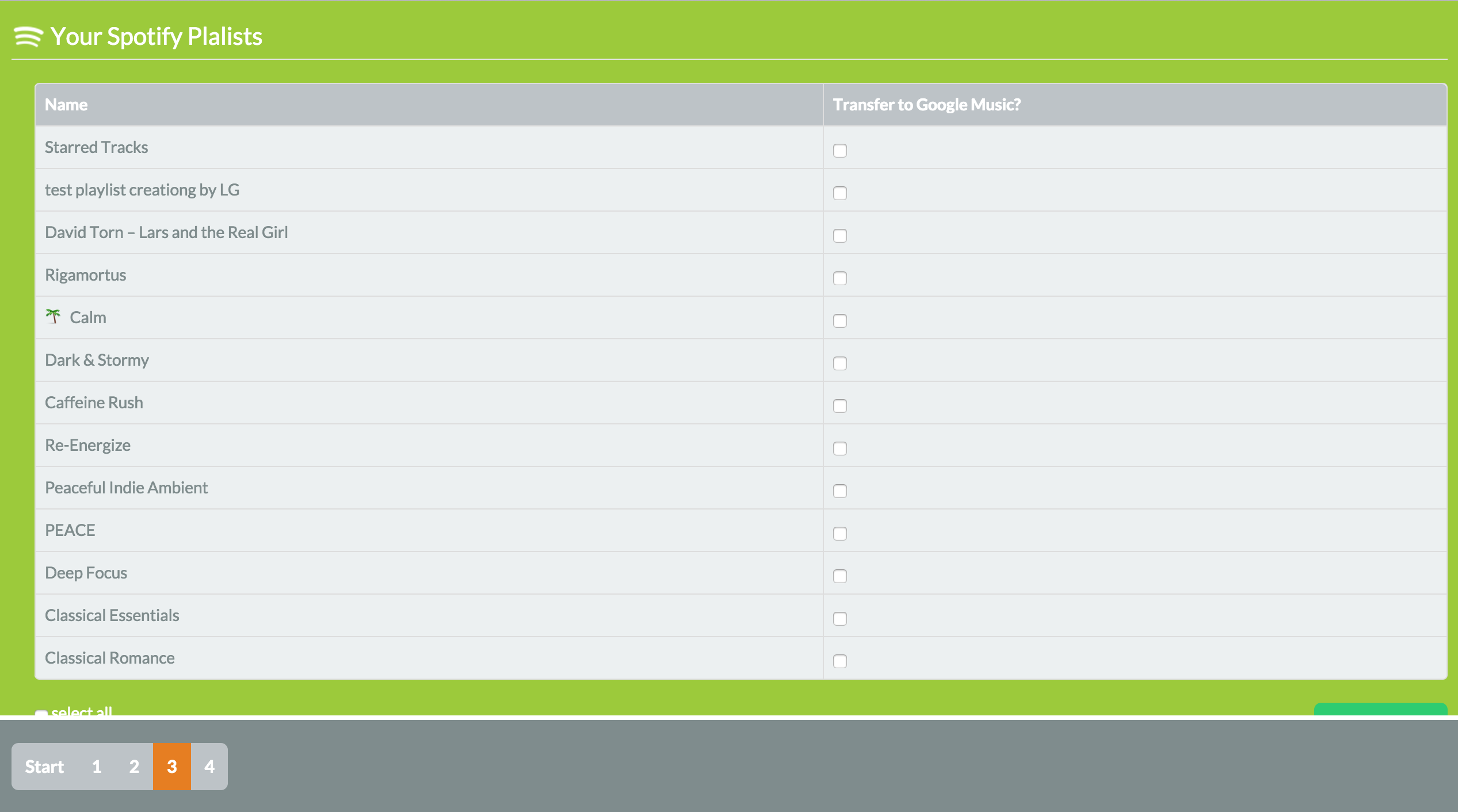 Here you get to choose all the Spotify playlists you want to transfer to Google Play Music, just click the check box to the right of each playlist you want to transfer. Once you start the transfer, you’ll see a page that says it’s transferring but the “Found,” “Not Found,” and “Filtered Karaoke” numbers might not be moving up from zero. But go back to your open terminal and…