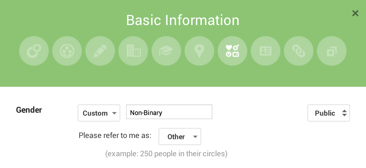 For many people, gender identity is more complex than just “male” or “female.”  Starting today, I’m proud to announce that Google+ will support an infinite number of ways to express gender identity, by giving you the option to customize the way your gender is represented on your profile.