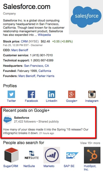 Notably, this minor change isn’t going to affect Google+ results showing up in regular searches. And while you won’t find a featured link to the Google+ profile of a company you search for, Google has been putting social links to most popular networks, including Twitter, Facebook, and others, in its Knowledge Graph cards since January.