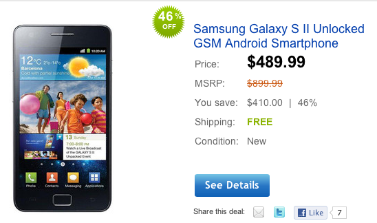 Buy.com via eBay Daily Deal has the Samsung Galaxy SII unlocked phone for $489.99 with free shipping. That’s the lowest price we could find by about $100. This 4.3″ screen, dual core Android 2.3.5 smartphone will work on just about any GSM network in the worldwith a SIM card. Expand Expanding Close