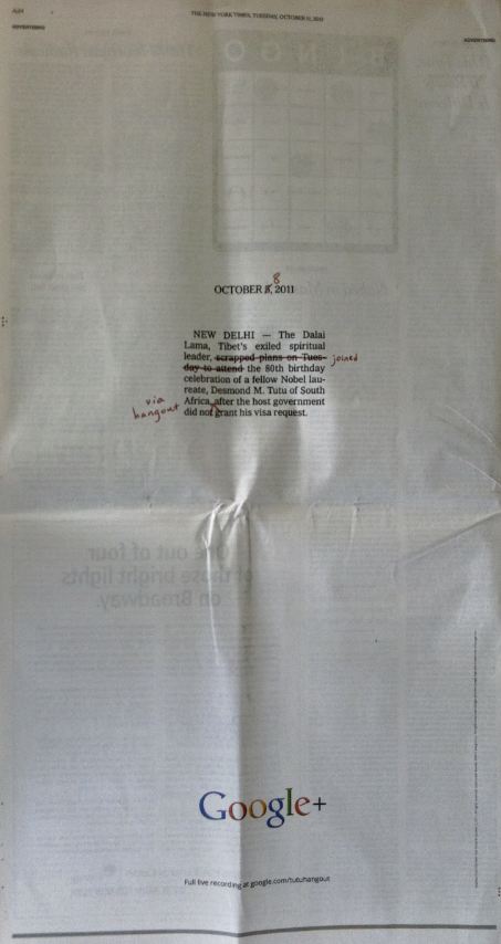 In attempt to grow their young social network, Google has taken out a full page ad in the traditional print version of the New York Times promoting Google+ Hangouts. Search Engine Landposted the photo above, where Google talks about the Dalai Lama and Desmond Tutu hosting a Hangout last week in their ad. Google strikes out parts to explain how they came to the rescue when the Dalai Lama wasn’t granted a visa to visit South Africa.