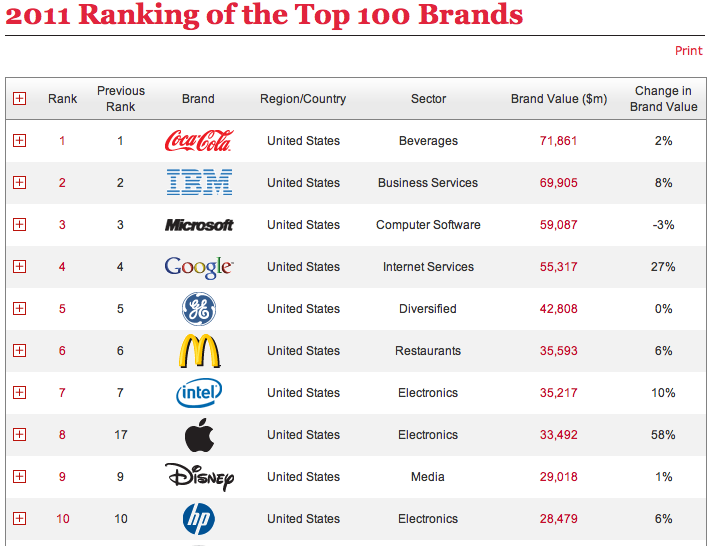 Interbrand assesses brand value across the world, and the consultancy recently released its “2011 Ranking of the Top 100 Brands” with Google sitting tight at the No. 4 spot.