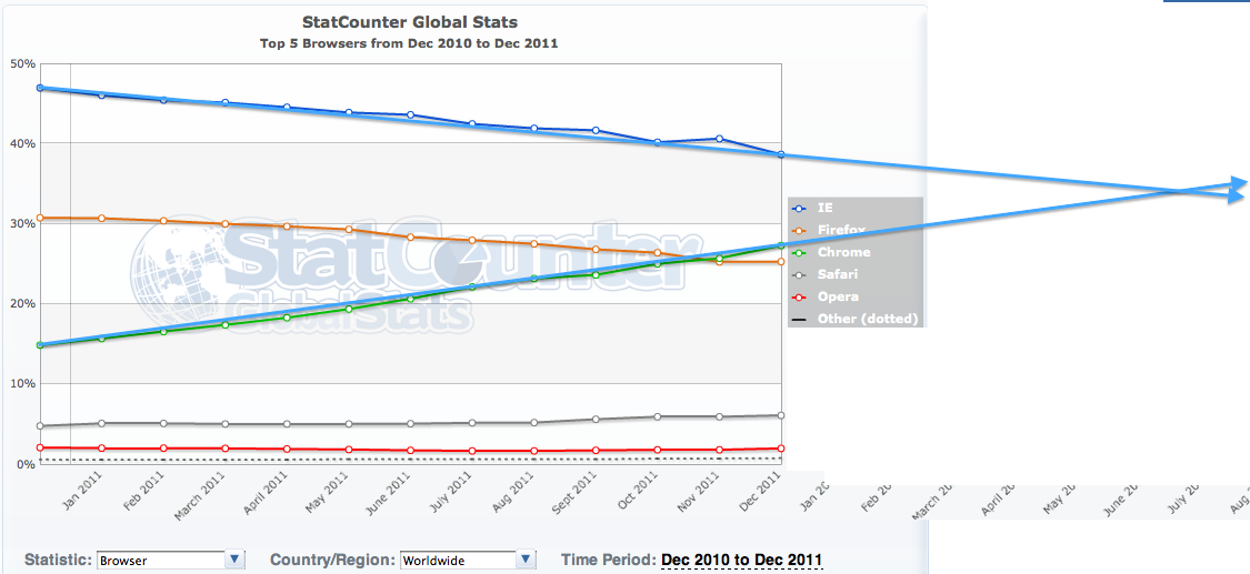 A few months ago, Chrome passed Firefox and if you look at the slope of the graph over time, it looks like Chrome’s rise is still accelerating. Even if it only grows at its 2011 rate and IE continues to fall at its 2011 rate, Chrome will pass Internet Explorer in late Summer 2012 according to Statcounter’s numbers. Below, I have extrapolated IE and Chrome’s 2011 numbers over the first half of 2012…