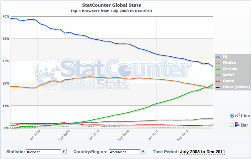 Just a few years ago, Microsoft’s Internet Explorer owned the browser market with three quarters share and the only real alternative was Mozilla’s Open Source Firefox. However, in 2008, Google noticed Apple’s WebKit Browser engine and built their own Chrome browser. In late 2009, Chrome started to break out of the “other” category in StatCounter’s figures and started its rise to what will likely to be the world’s most used desktop browser in 2012.