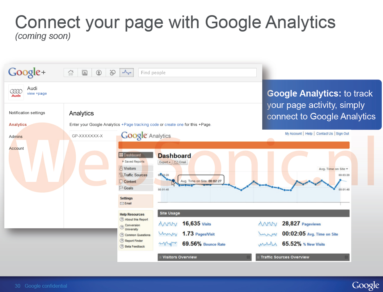 Dutch website Dutchcowboys found the entire deck with screens showcasing the combined services. According to the slides, users will soon have access to total number of visits with percentage of new visits, page views, average time spent on the site, and the bounce rate for their Google+ pages.