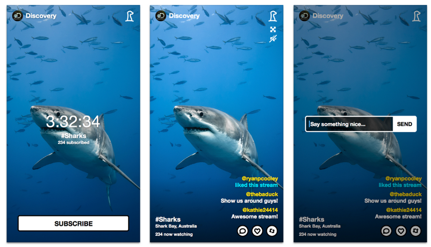 One of Meerkat’s partners with this launch is Discovery Channel, the media giant behind behind Shark Week, the annual week-long programming block all about, well, sharks. And since Shark Week starts on July 5th, the partnership includes Discovery Channel streaming clips all throughout the week of shark-based festivities from their @SharkWeek Meerkat account and through an embedded player on their website. The new embedded web player looks like this: