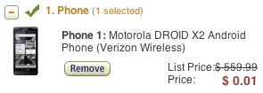 With activation of a new line of service, Amazon offers the Motorola DROID X2 Android 3G Smartphone for Verizon Wireless bundled with a $50 Amazon Gift Card for 1 cent with free shipping. Even if you don’t use the credit, that’s still $100 under our June mention and the lowest total price we’ve seen by $50. Features include a 4.3″ 540×960 color touchscreen, virtual QWERTY keyboard with Swype, 8-megapixel camera with dual flash, 720p video capture, HDMI output, microSD slot, WiFi connectivity, Bluetooth, Android 2.2 OS, up to six hours of talk time, and more.