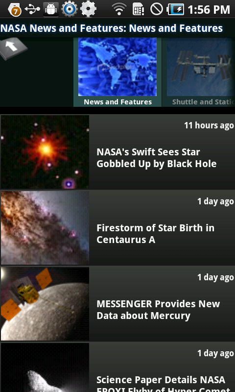 The 4MB download works with Android 2.1 onwards. It’s your window to an enormous collection of NASA content that spawns hires space imagery, on-demand videos, live streaming video from NASA Television, mission information, feature stories and breaking news. It also lets you locate sighting opportunities for the International Space Station and track the current positions of spacecraft currently orbiting Earth. More features and screenies after the break.