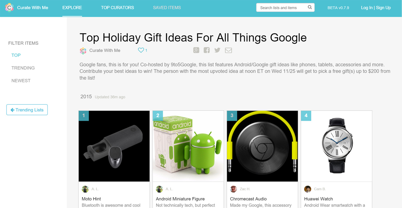 Want a shot at winning this year’s best Google gift? Sign up for Curate With Me at this link and contribute ideas to our 2015 Top Holiday Google Gift Guide. After one week, the person who contributed the most upvoted item in the Guide will get to pick one or more items from the list (worth up to $200), courtesy of Curate With Me! So get curating right away to maximize your votes! More details are below…. (Update: Congrats, Eli M!)