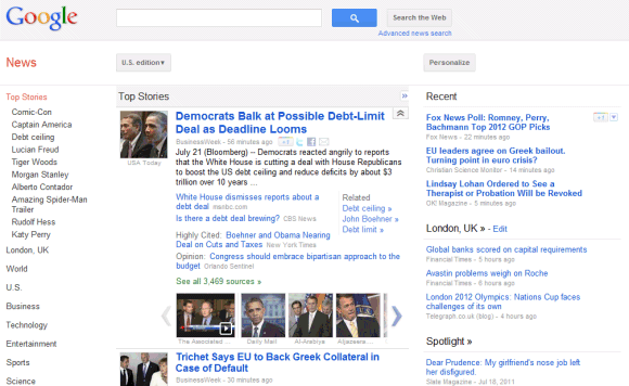 Google has released a redesign for Tech News, an aggregated source of news content around the world. The redesign looks very similar to the Plus-esque design we’ve seen across all of Google’s properties — sporting the black bar at the top, more whitespace, new colors, and redesigned search box at the top. Specifically to News, in the left margin users can sort through top stories and categories, in the middle top stories are displayed, and to the right you’ll find recent stories.