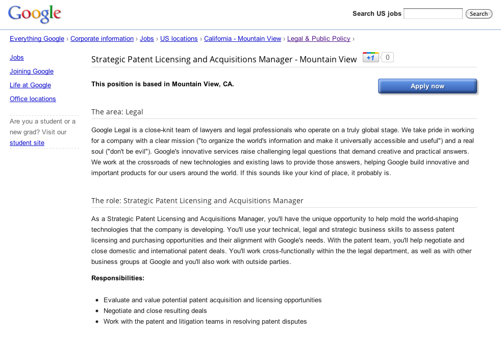 For example, the strategic patent licensing and acquisitions manager evaluates and values potential patent acquisition and licensing opportunities, and negotiates these deals (a.k.a. finds more patents for Google).