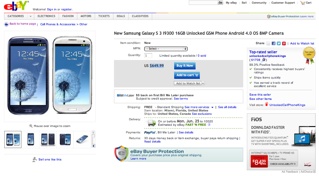 The unlocked Samsung Galaxy S III has not officially released in the United States, nor have pricing details, but at least one seller on eBay is offering the 16GB version for just $649.99.