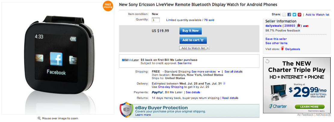 This remote, Bluetooth-enabled wearable display for Android smartphones once listed nearly five times the above amount, but folks can currently pick it up at a bargain price and have it shipped standard for free. The estimated delivery time is between July 25 and July 31, and the only payment form accepted is PayPal.