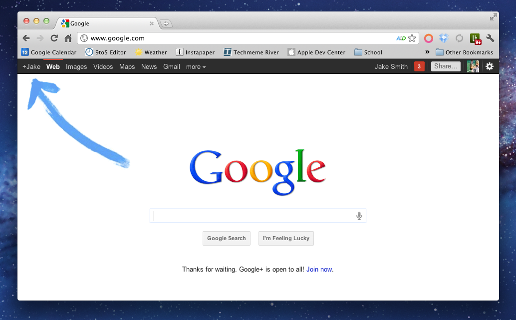 No, we did not photoshop that arrow in. In an effort to push Google Plus, which just went into public beta today, Google is now literally pointing to the Plus link with an arrow. Also, below the search box you will find a link to signup. With Google’s 1,100,000,000 pageviews a day (according to Website Outlook, so we’re not sure how accurate that really is) they’re bound to bring in some traffic. What are you waiting for; sign up!