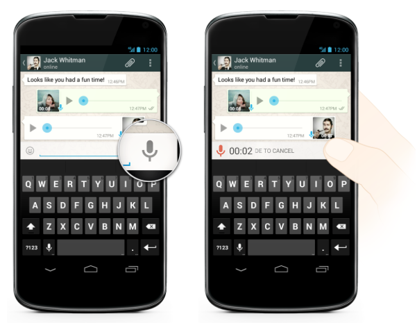 Popular chat app whatsapp now allows Android users to exchange voice messages with a push-to-talk style function. The feature is also being pushed out simultaneously on the app’s other platforms: iOS, Blackberry, Nokia and Windows Phone.