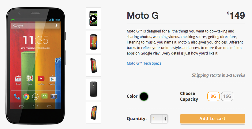 The Moto G, which was deemed “the Google Global game changer” by NewGeekGuide‘s own Seth Weintraub, comes with a 4.5″ display, a 5 MP rear camera, 1.3 MP front camera, 1 GB of RAM, 50 GB of Google Drive space for two years, and Android 4.4 KitKat.