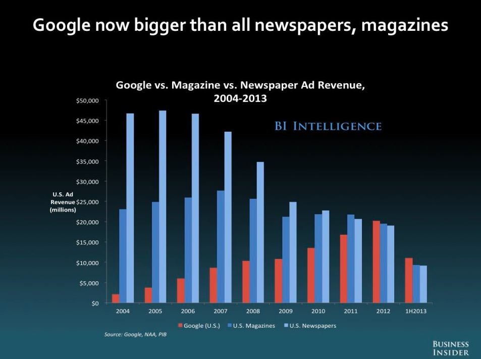 We all know that Google is BIG, BIG, BIG, but just how big is Google these days? During a keynote at Ignition 2013, Business Insider CEO Henry Bloodroot presented a slide that shows Google on course to exceed the revenues of both magazines and newspapers this year. In fact, almost all of Google’s expected $60 billion in revenue will come from advertising this year.