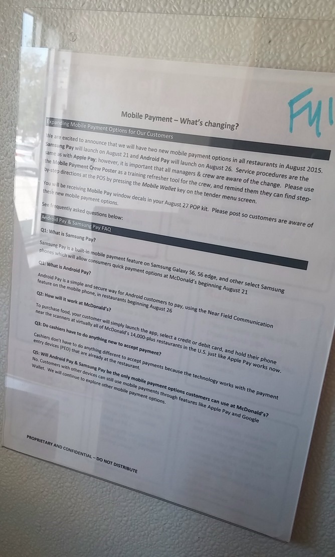 There are reasons to be skeptical about this date. Mostly, the two communications shown by Android Police state that McDonald’s is rolling out Samsung Pay support on August 21st (last Friday). That date, we know, is incorrect. Friday may have been the release date for the Galaxy Note 5 and Galaxy S6 Edge+, but Samsung’s mobile payment solution isn’t expected until next month. This could simply be an honest mistake. If so, it seems strange that we’ve heard nothing about McDonald’s higher-ups not informing staff of its error. Another explanation is possibly that the company is rolling out support way ahead of launch to make sure they’re ready. After all, they have some 14,000 stores in the U.S. alone.