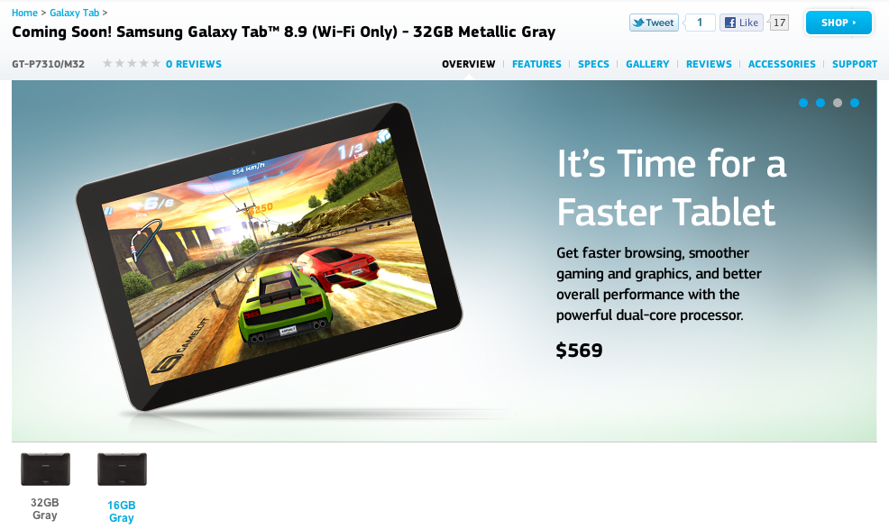 Samsung has just unveiled the webpage for the Galaxy Tab 8.9, which reveals pricing and more specs for the unreleased tablet. The 16GB Wi-Fi only tablet will be going for $469, and the 32GB Wi-Fi only going for $569. Specs for the device are a 8.9” WXGA (1280×800) display, Android 3.1, 3-megapixel rear-facing shooter, 2-megapixel front-facing shooter, Wi-Fi, and a 6100mAh battery. Currently, the Tab comes in a Metallic Gray.
