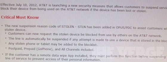 The company sent a message [above] to customer service representatives on Wednesday advising them of the change. According to the guidance, AT&T will compile a “blocklist” of stolen devices and service will be automatically suspended “if any attempt is made to use a device that is stored in the blocklist.” The only way to add a device to the list will be by contacting a customer service representative directly, and users with remote data wipe apps will be required to activate them before suspending their device, to “prevent access to their personal information.”