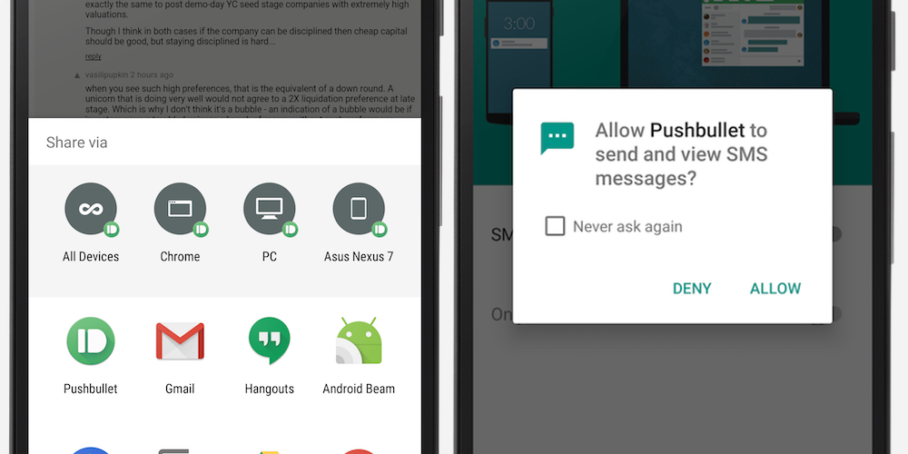 Pushbullet, the popular multi-device notification and link-sharing tool has been updated today to take full advantage of Android 6.0 Marshmallow’s built-in improvements. The company announced that the new update uses Android 6.0‘s runtime permissions and Direct Share features to give you more fine-tuned control over which parts of your system it has access to, and give the option to share items more easily and quickly with compatible devices…
