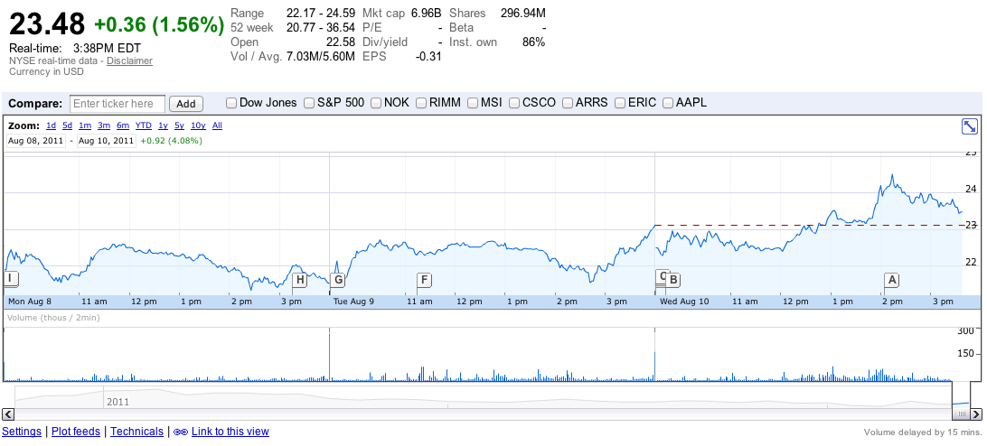 There have been rumors floating around that Motorola Mobility may be bought ought by Carl Icahn and KKR. The buyout would include both paying $34.25 per share, financed with $3 billion cash and other tricks. These rumors have caused a spike in Motorola’s stock (as seen above). (via Benzinga) Expand Expanding Close