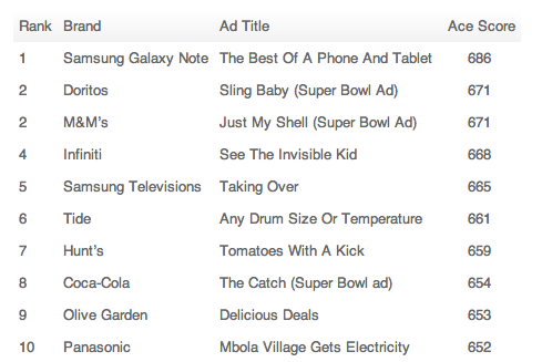Television analytics firm Ace Metrix dubbed the Galaxy Note’s “The Best of a Phone and Tablet” commercial by Samsung (above) as the “Most Effective Ad” in Q1 2012.