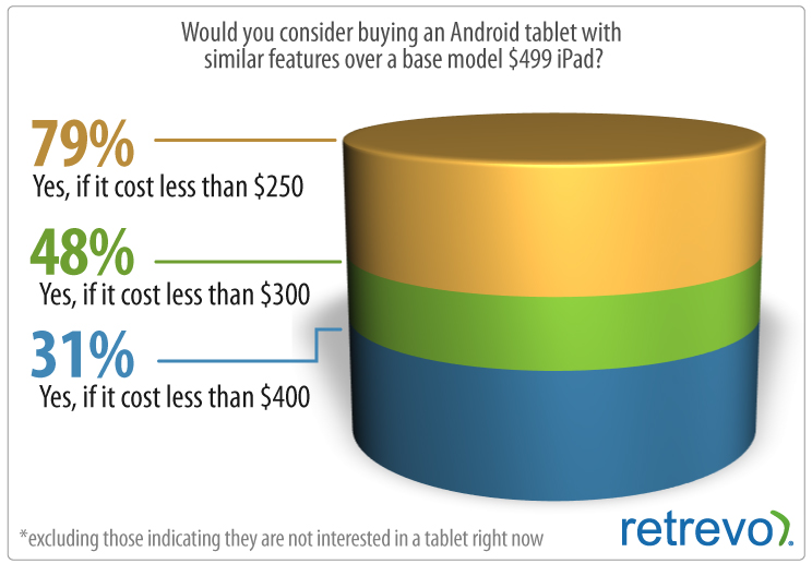 Asked whether they’d consider buying any Android tablet with similar features over a base model $499 iPad, more than three-quarter respondents, or 79 percent, said “Yes, if it cost less than $250”. Amazon is rumored to be skipping on some tablet features in order to keep production costs down, like use a less expensive touch panel which can only detect two fingers at once.
