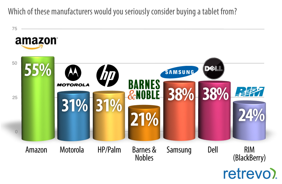In a blow to other tablet makers, including brands such as Motorola, Samsung, Research In Motion, Hewlett-Packard and others, a whopping 55 percent would seriously consider a tablet from Amazon. This highlights the power of ecosystem which has turned Apple’s tablet into a smash hit. Amazon too has its own app store, music store, movie store and other digital stores in the cloud, bound to create a compelling user experience in the familiar environment from a trusted name in online retail. More food for thought and pretty charts right below…