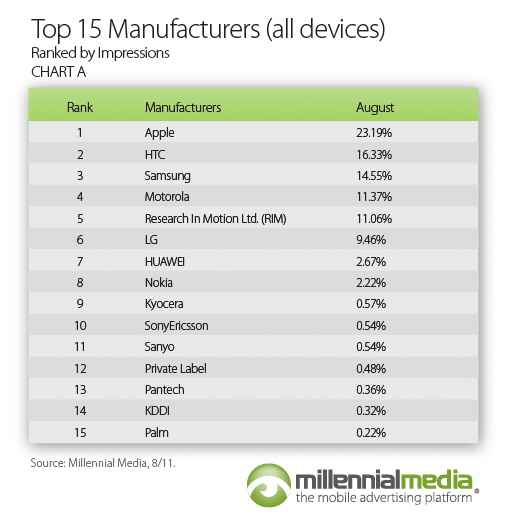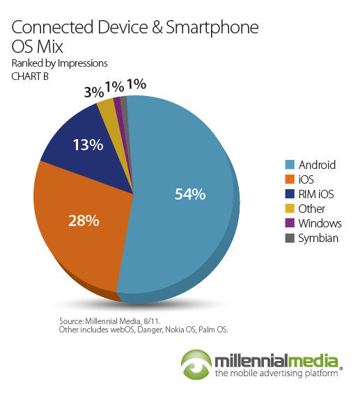 If Google and Apple were to merge, their respective Android and iOS mobile software would seize well over three-quarters of the world’s platform share in smartphones, per latest Millennial Media’s “Mobile Mix” mobile device usage share report. Separately, Android and iOS held 54 percent and 28 percent share in August. Millennial now includes data from smartphones, tablets, e-readers and gaming devices so direct comparison to their smartphone-focused July study is meaningless.