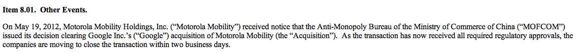 So what happens next? A ‘listening tour,’ a source tells us, with new management visiting the whole of the operation, ‘seeing what everyone does, then making decisions.’ One decision that may be close at hand has to do with headcount: we have heard that there will be layoffs coming imminently — with one person close to the situation even putting the number as high as 30 percent of Motorola’s staff, worldwide. At the same time, more details are emerging about the conditions that China put on the deal: they include a guarantee that Android would remain free and open source for the next five years.
