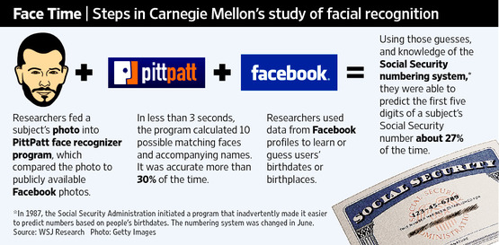 In a report from the WSJ, a new study by researchers at Carnegie Mellon University in Pittsburgh used facial-recognition technology in combination with data from Facebook accounts to successfully identify one-third of volunteer participants.